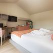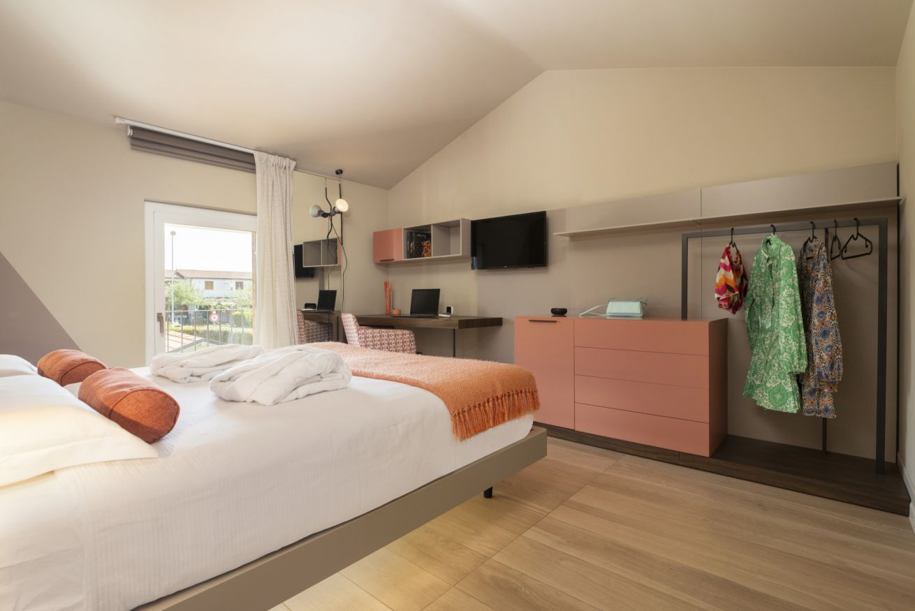 La luce calda e avvolgente è la vera protagonista. I raggi del sole entrano potenti dalle finestre e contribuiscono a portare nella stanza una ventata di ottimismo.